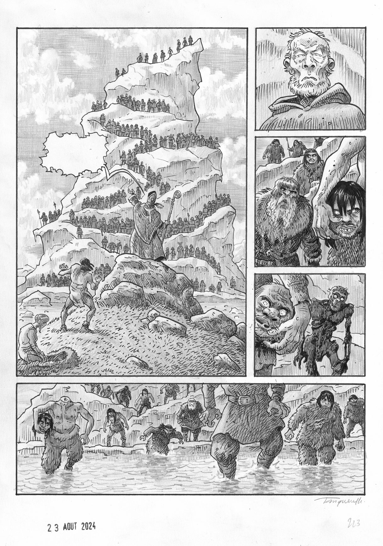 Hervé Tanquerelle is always looking for new technical directions in which to take his art and for this album has chosen to work in ink and graphite, illustrating this chilly, twilit tale by placing each of his characters in breathtakingly beautiful settings.  The subtle range of greys achieved using lead pencil - subsequently coloured by Isabelle Merlet in the classic edition of the album - convey to the viewer just how much work has gone into each of Tanquerelle's original plates. Where the narrative is interrupted by scenes from an earlier chronology (and no colour is added), we get an even better idea of the artist's careful attention to detail. A selection of plates and a series of drawings will be available to view at this remarkable exhibition hosted by our Paris gallery at rue Chapon.