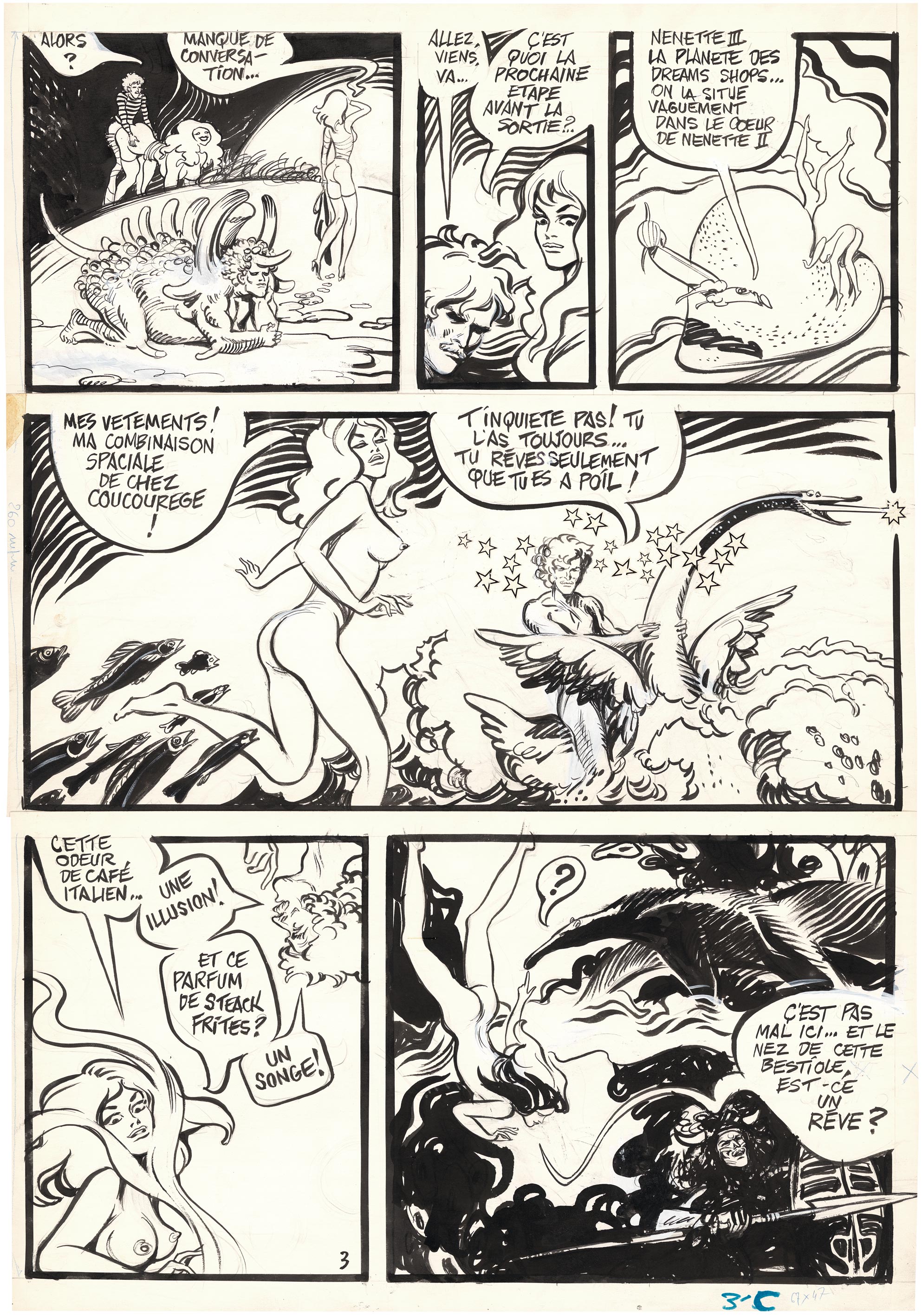 Jean-Claude Forest, Barbarella, Entrez sans frapper, 1978, planche 3 de ce récit en 4 pages paru dans le n° 26 du magazine Fluide glacial de juillet 78