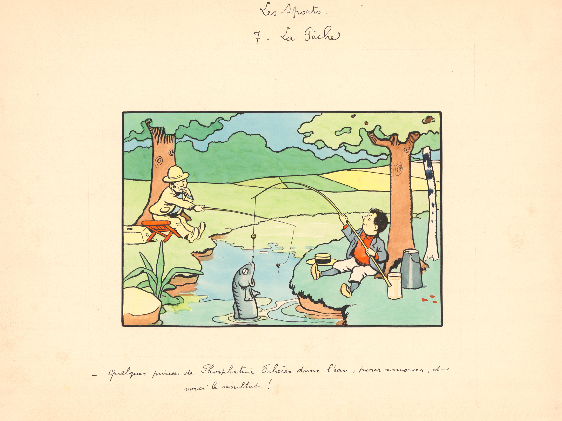 Benjamin Rabier, Les sports, La pêche, Une des 12 cartes postales publicitaires pour les phosphatines Falières publiées au début du XXe siècle