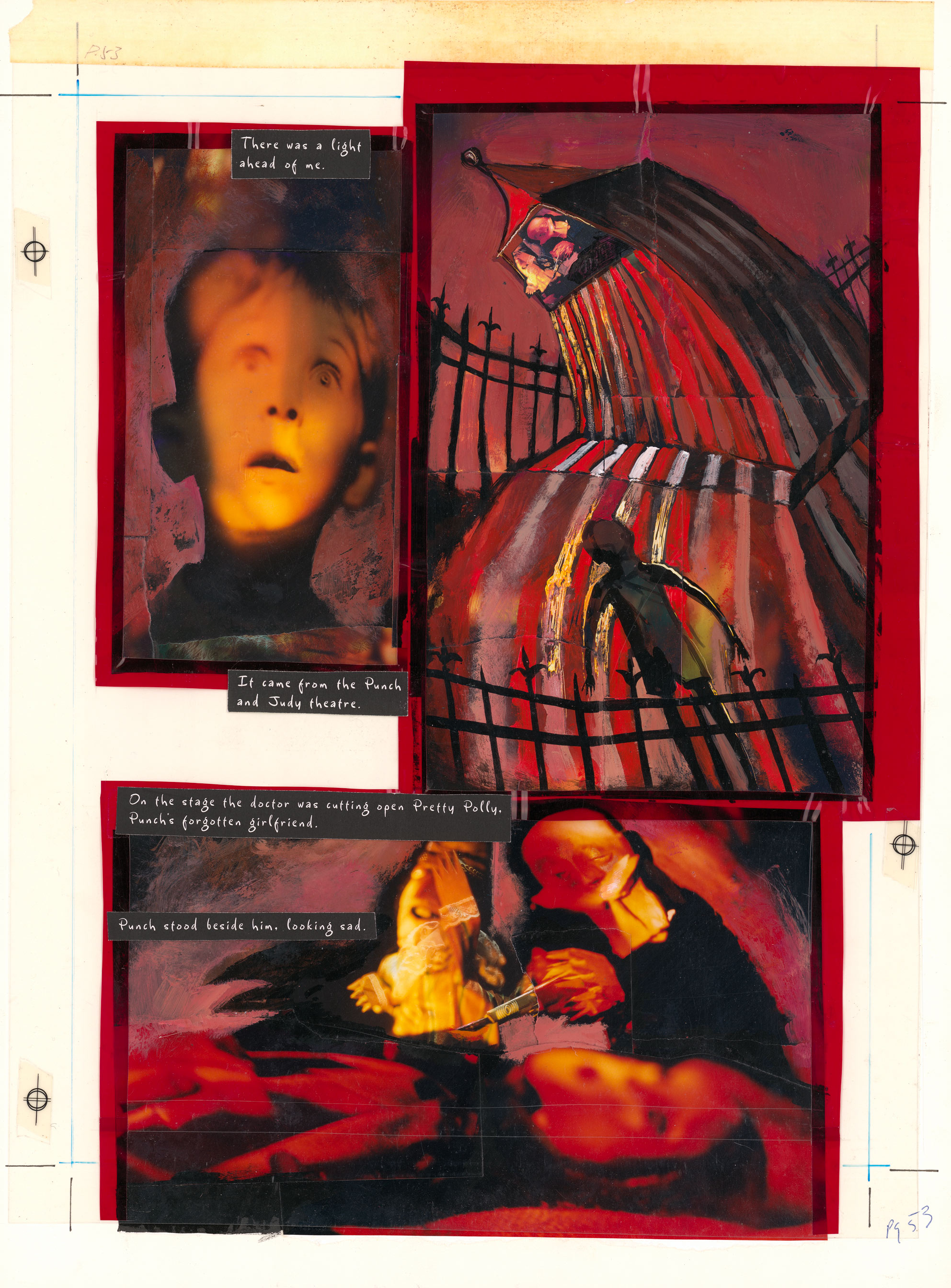 Acrylic on paper collage, photography. Black line and lettering on acetate overlay
