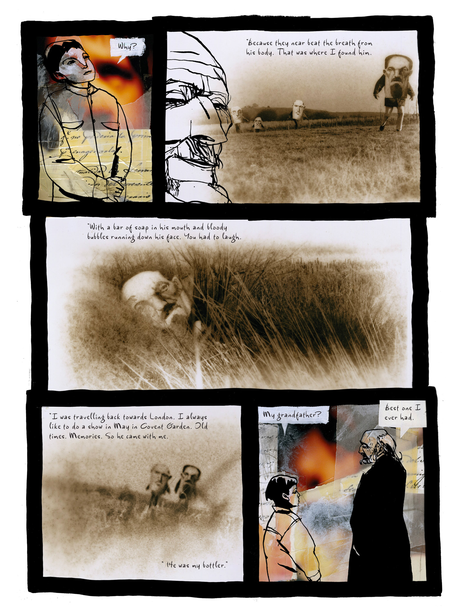 Acrylic on paper collage, photography. Black line and lettering on acetate overlay