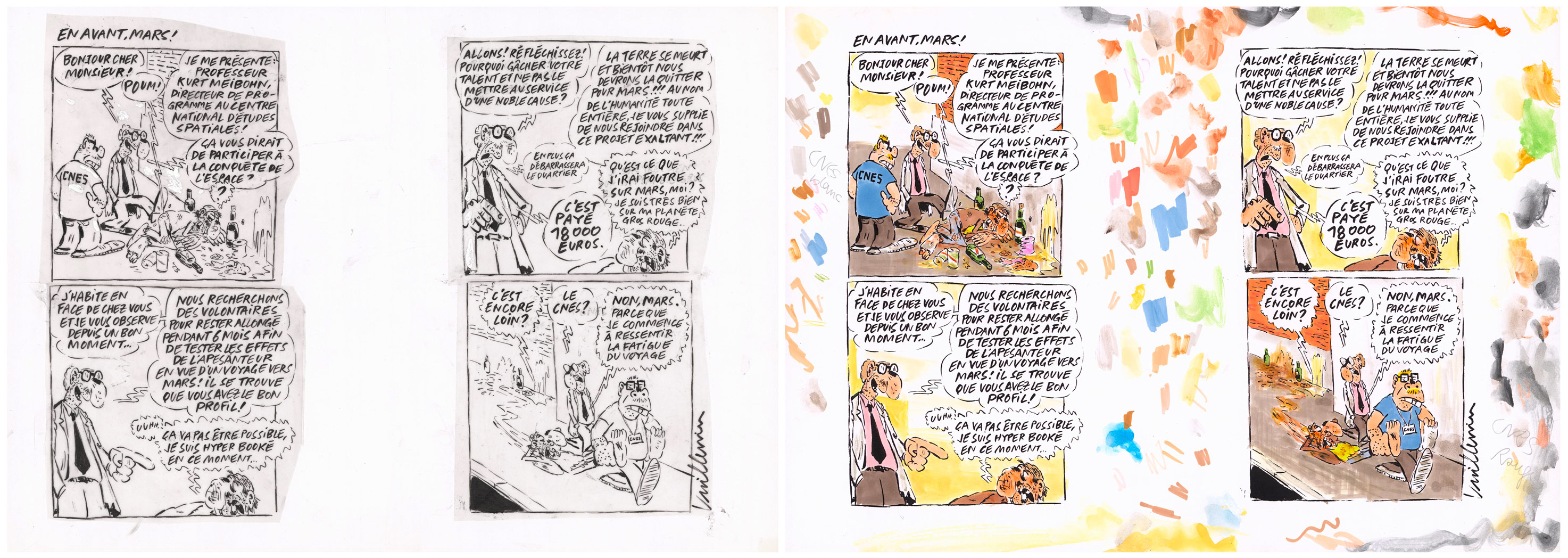 Philippe Vuillemin - En avant, Mars !, Page à l'encre de Chine accompagnée de sa mise en couleurs (25,5 x 34,3 cm)