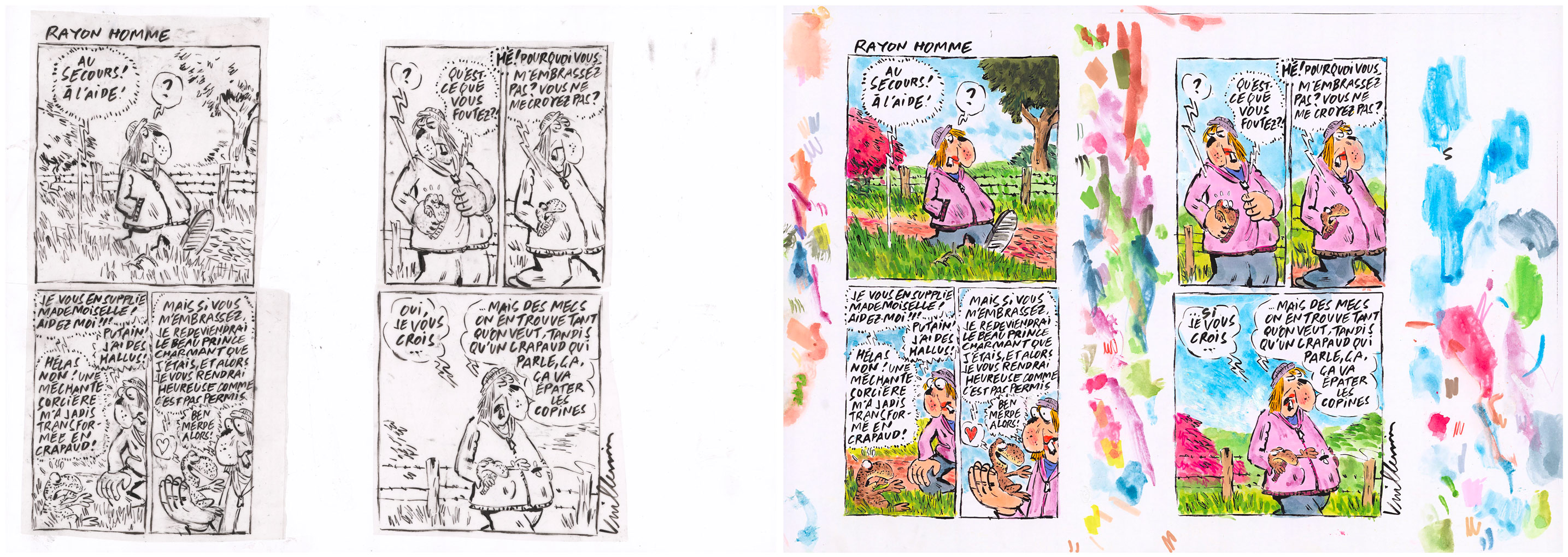 Philippe Vuillemin, Charlie Hebdo, Rayon homme, Page à l'encre de Chine accompagnée de sa mise en couleurs (25,5 x 28,7 cm)
