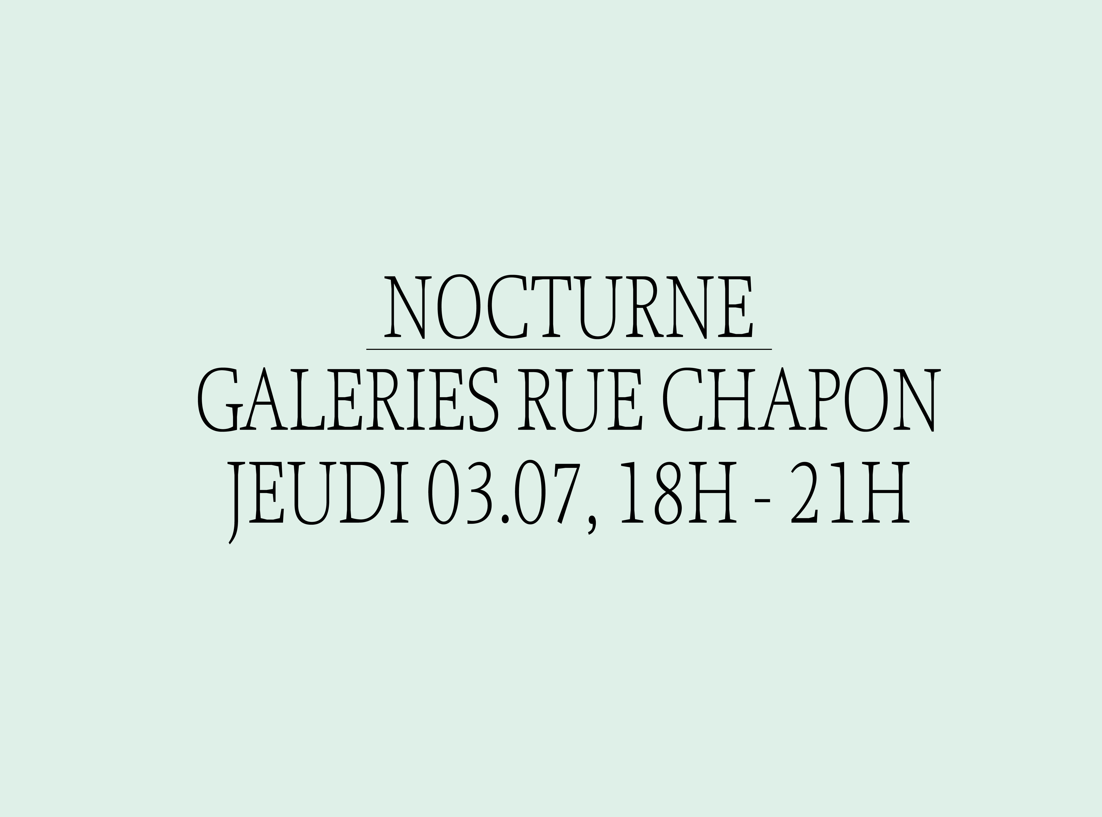 Le jeudi 3 juillet, de 18h à 21h, plusieurs galeries situées rue Chapon à Paris organisent une nocturne commune. À cette occasion, les visiteurs pourront découvrir une série d'expositions individuelles et collectives dans une quinzaine d'espaces d'art contemporain.