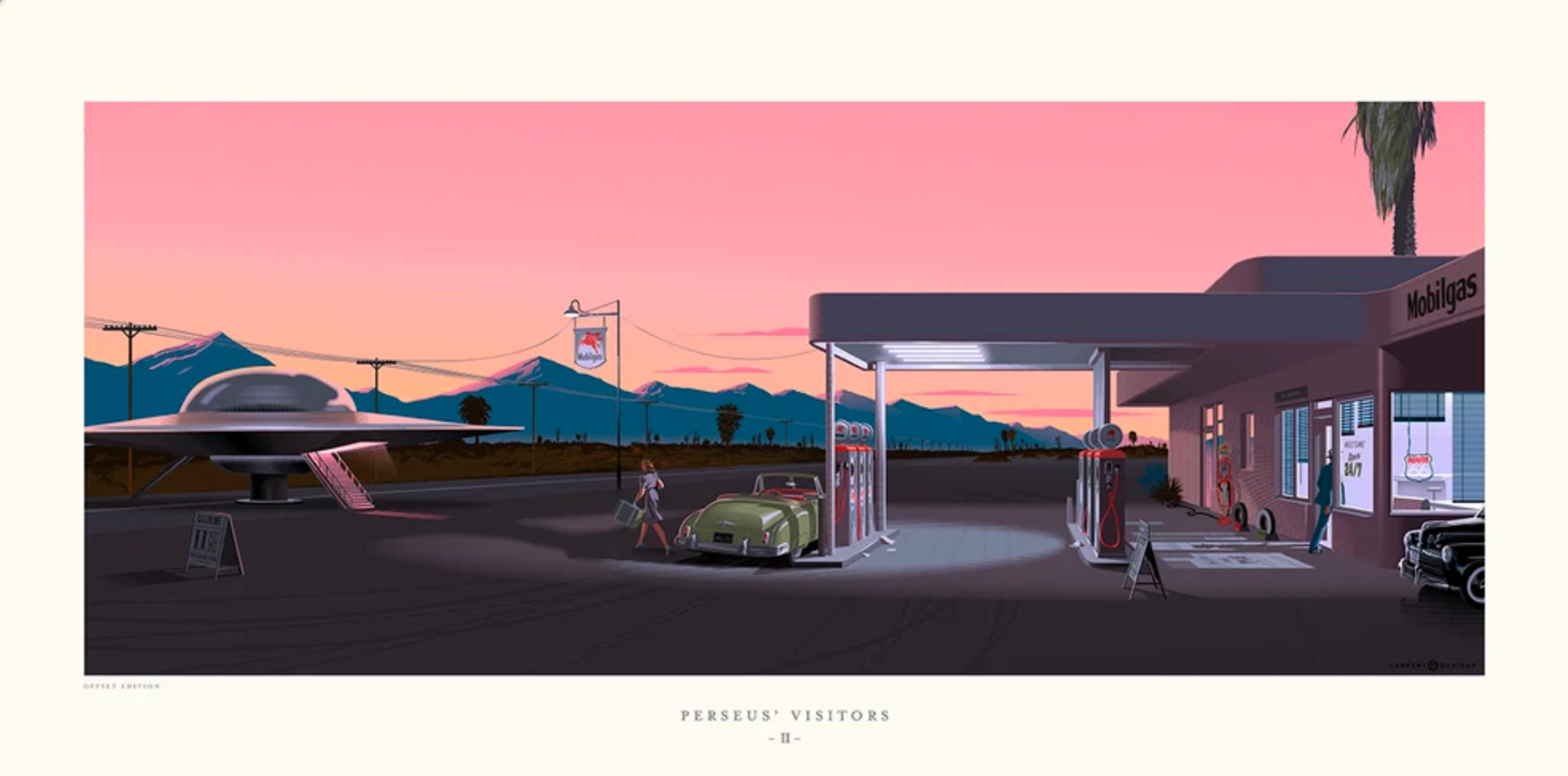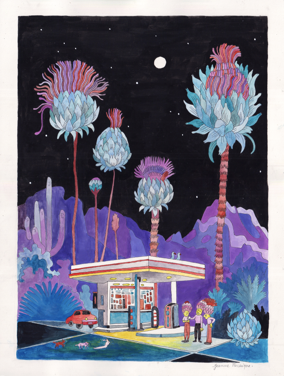 Mythique route 66, chemins de traverse, stations-service oubliées ou paysages lunaires... Chaque œuvre est une destination, chaque trait un départ. À bord d'une Fiat 500, d'un vélo ou même d'une voiture-chaussure, les artistes empruntent des routes tantôt familières, tantôt fantastiques. Leur point commun ? Une liberté totale d'interprétation, une invitation à l'évasion.