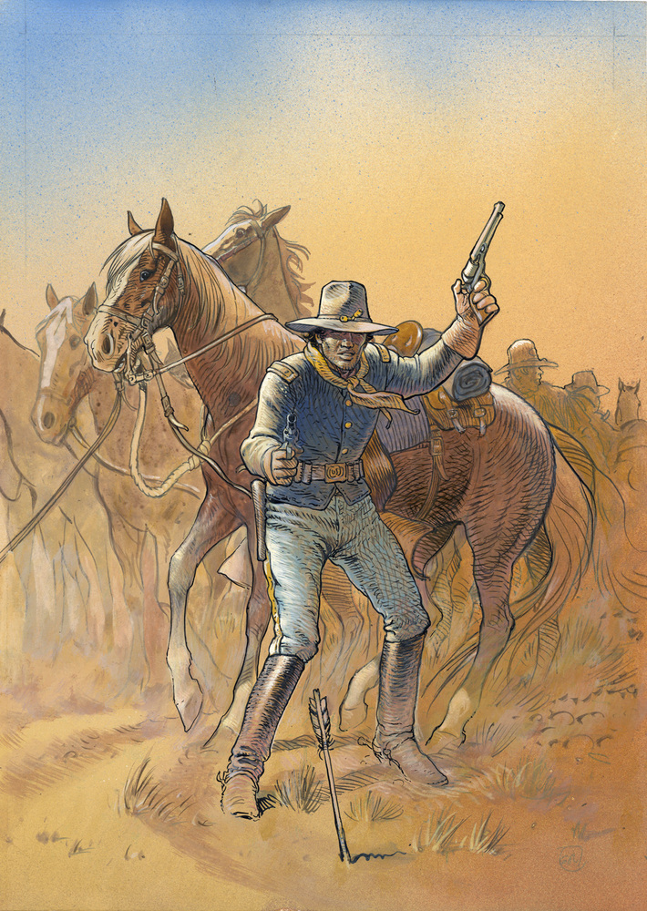 Cette illustration, c'est la rencontre entre Jean Giraud et Moebius ! Il y met en scène un lieutenant Blueberry encore en uniforme, manifestement attaqué par les indiens, comme en témoigne la flèche fichée à ses pieds, mais prêt à en découdre. Ce dessin est également d'une rare élégance grâce au cheval figurant juste derrière le personnage principal et dont la longe sort de l'image sur sa gauche. Si l'on ose le rapprochement entre Giraud et son double, c'est également en raison de la mise en couleur si particulière, sortant des codes de la série.