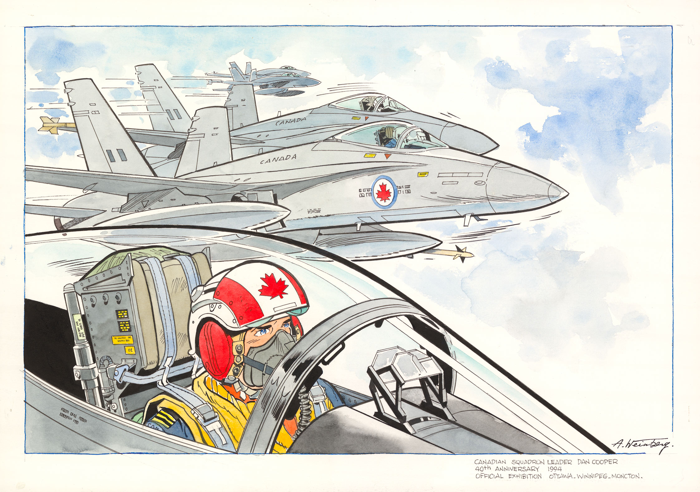 Albert Weinberg, Dan Cooper, 40e anniversaire, 1994, dessin réalisé pour l'exposition itinérante Dan Cooper: Héros canadien / Dan Cooper: Canadian Hero (à Ottawa au National Aviation Museum, à Winnipeg et à Moncton) à l'occasion du 40e anniversaire du héros