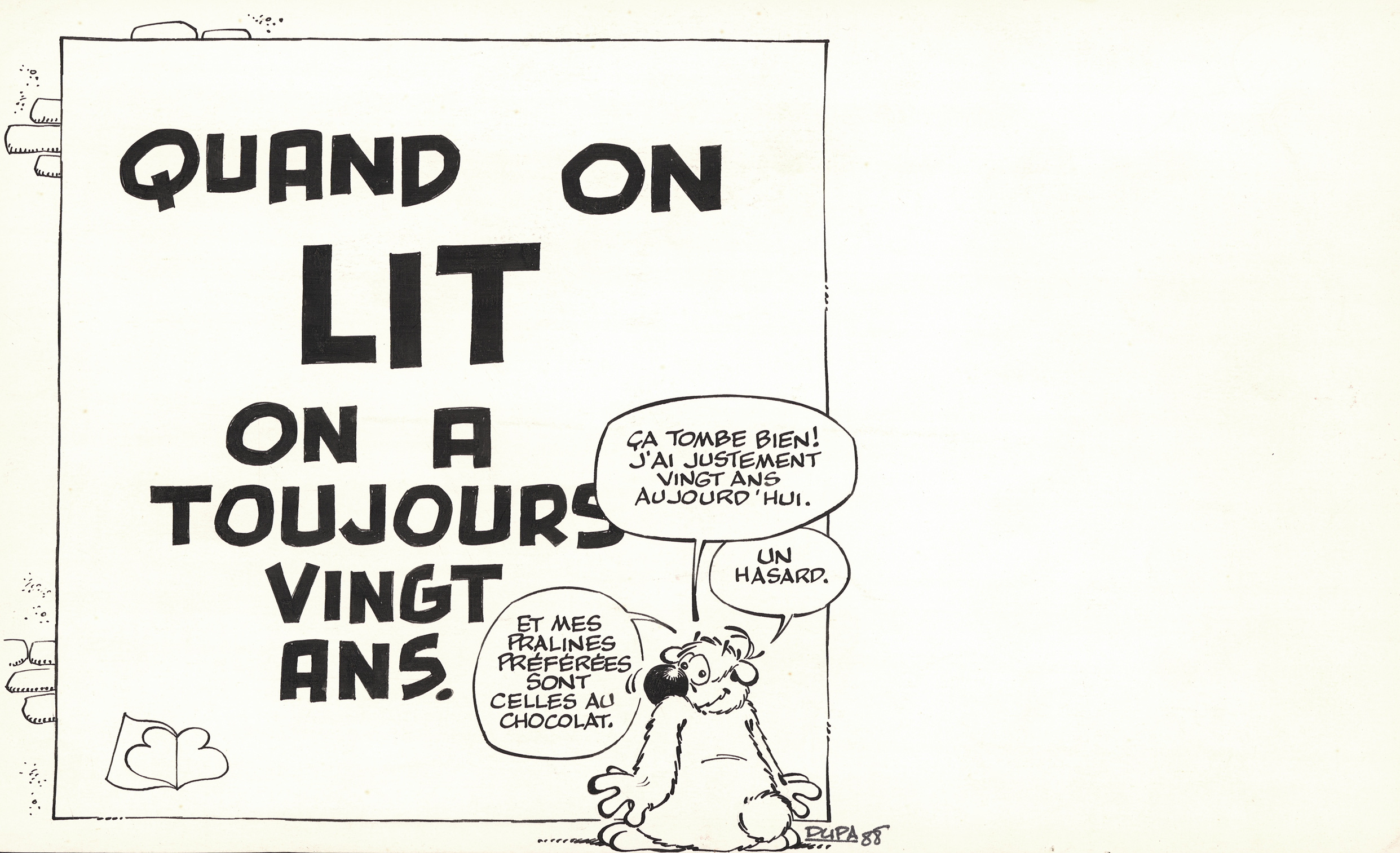Dupa, Cubitus, 1988, dessin publicitaire pour les 20 ans de la Foire du livre de Bruxelles