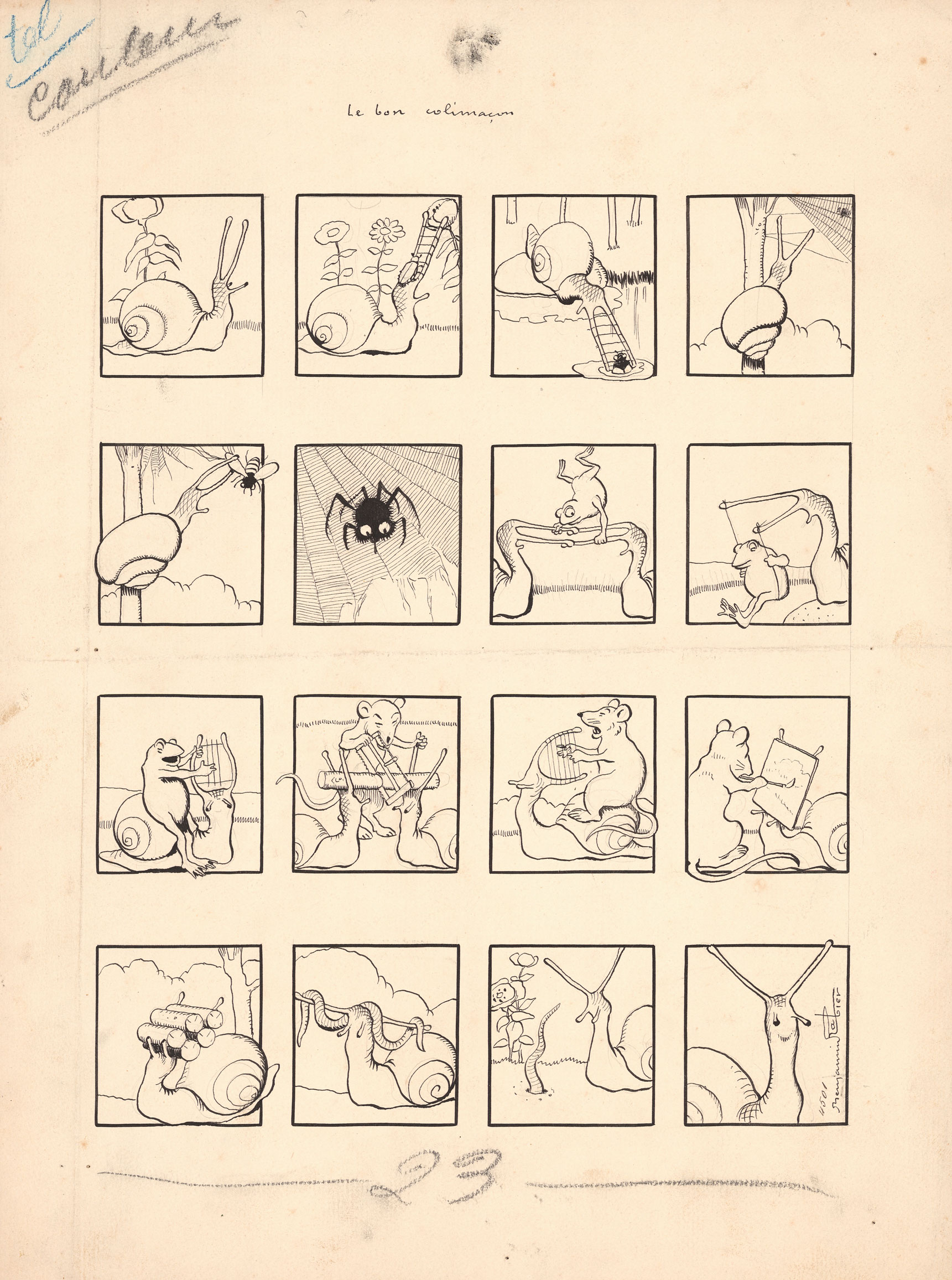 Benjamin Rabier - Le bon colimaçon, 1909, planche parue en couverture du n° 345 de la revue La jeunesse illustrée le 3/10/1909