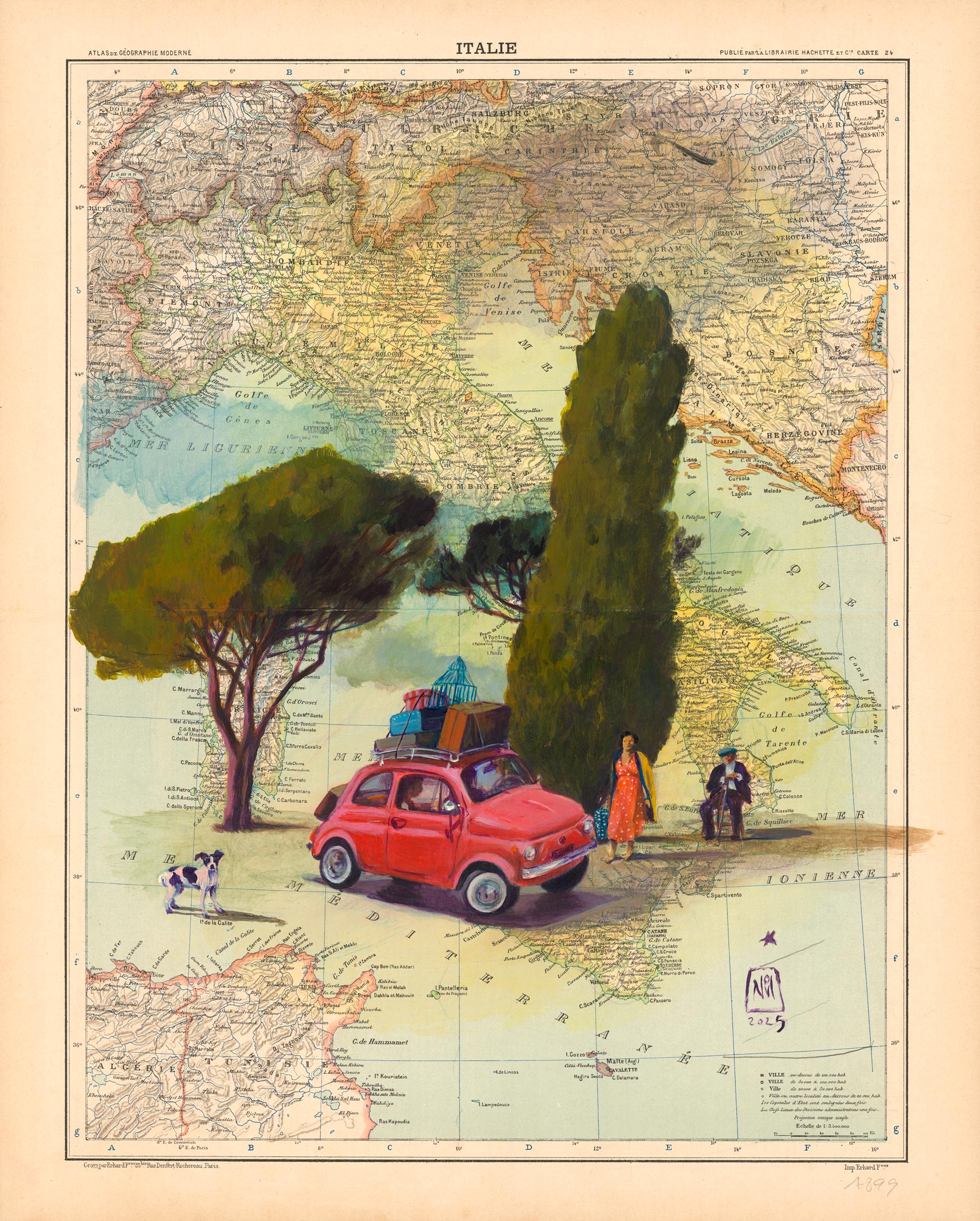 Acrylique sur carte d'Atlas ancien (Italie)