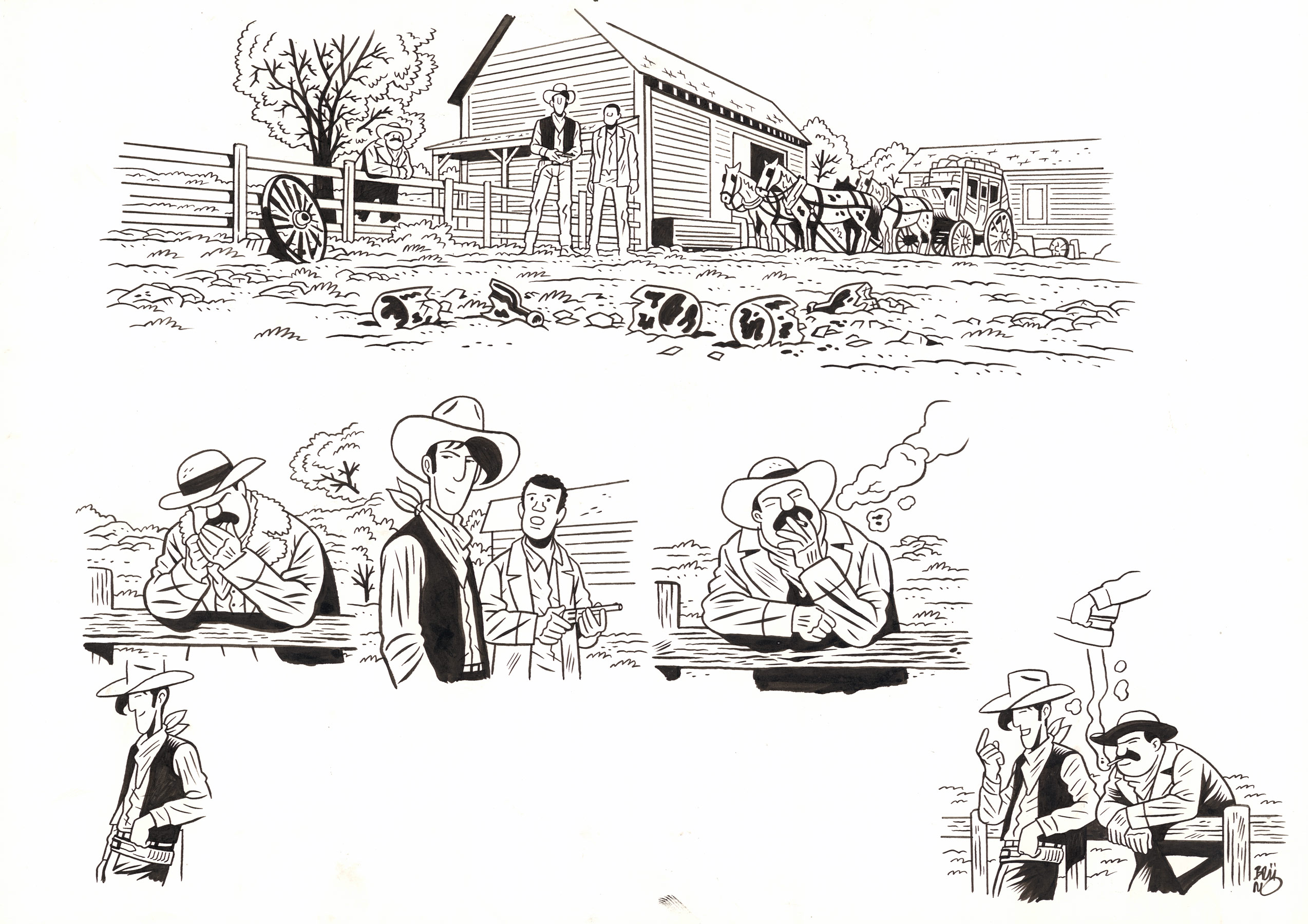 Brüno, Lucky Luke, Dakota 1880, 2025, Cases des pages 29 et 32