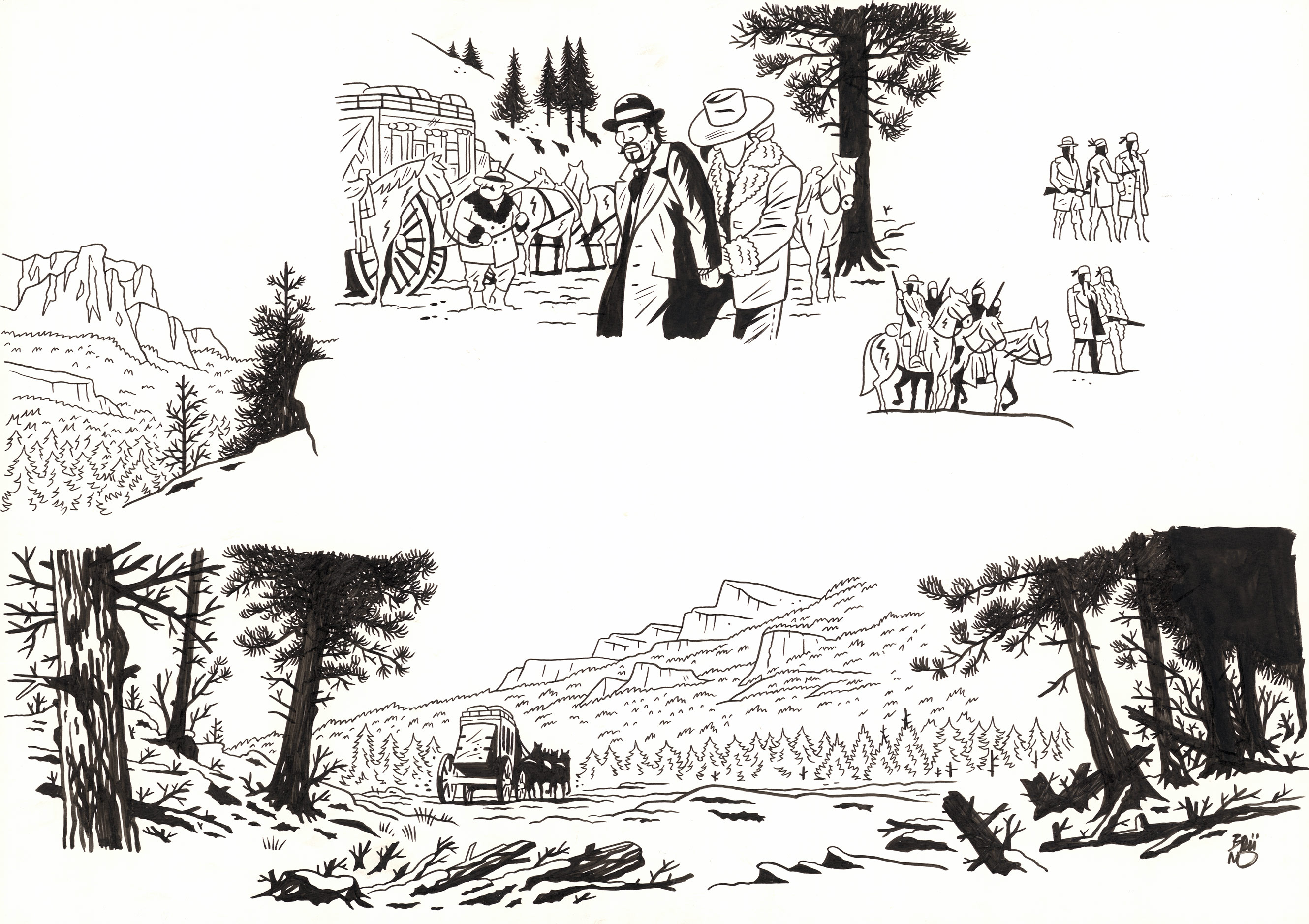 Brüno, Lucky Luke, Dakota 1880, 2025, Cases des pages 12 et 14
